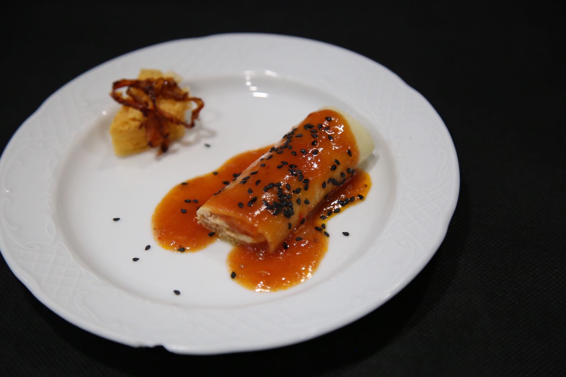 - Pollo al chilindrón con su textura en bizcocho y sus crujientes pimientos de Casa Nogara.