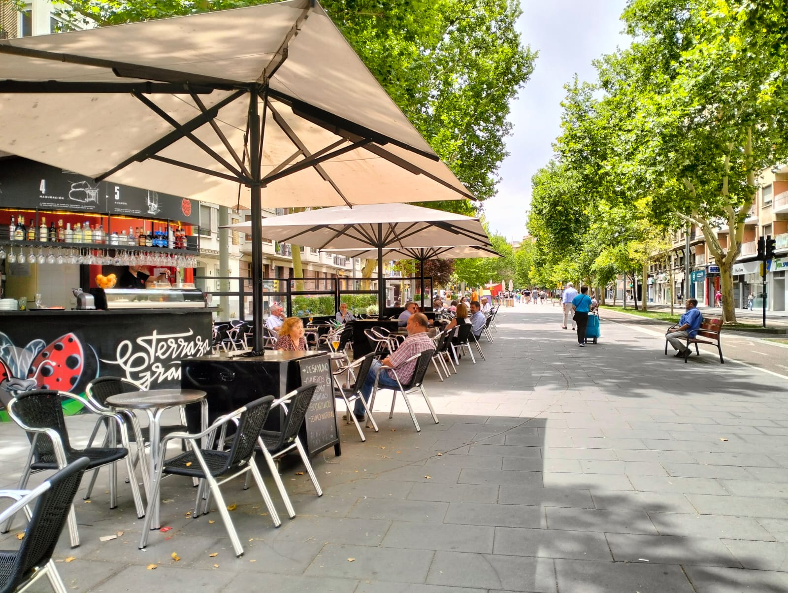 Y llegamos a dos de las terrazas con más solera -e historia- de la capital aragonesa, aposentadas en lugares de paso, algo que forma parte, sin lugar a dudas, de su filosofía. Estamos en las terrazas de Gran Vía (1 y 2), las cuales se caracterizan por tener forma e incluso los colores de una mariquita. “Cuando abre el quiosco imita a la apertura de las alas”, explica Luis Miguel Gracia, gerente desde hace más de una década de sendos establecimientos. Y es que el hostelero zaragozano, que abre sus quioscos cada año de marzo a noviembre, ha logrado convertir la incertidumbre de trabajar en un local completamente exterior en una de las normas del juego.