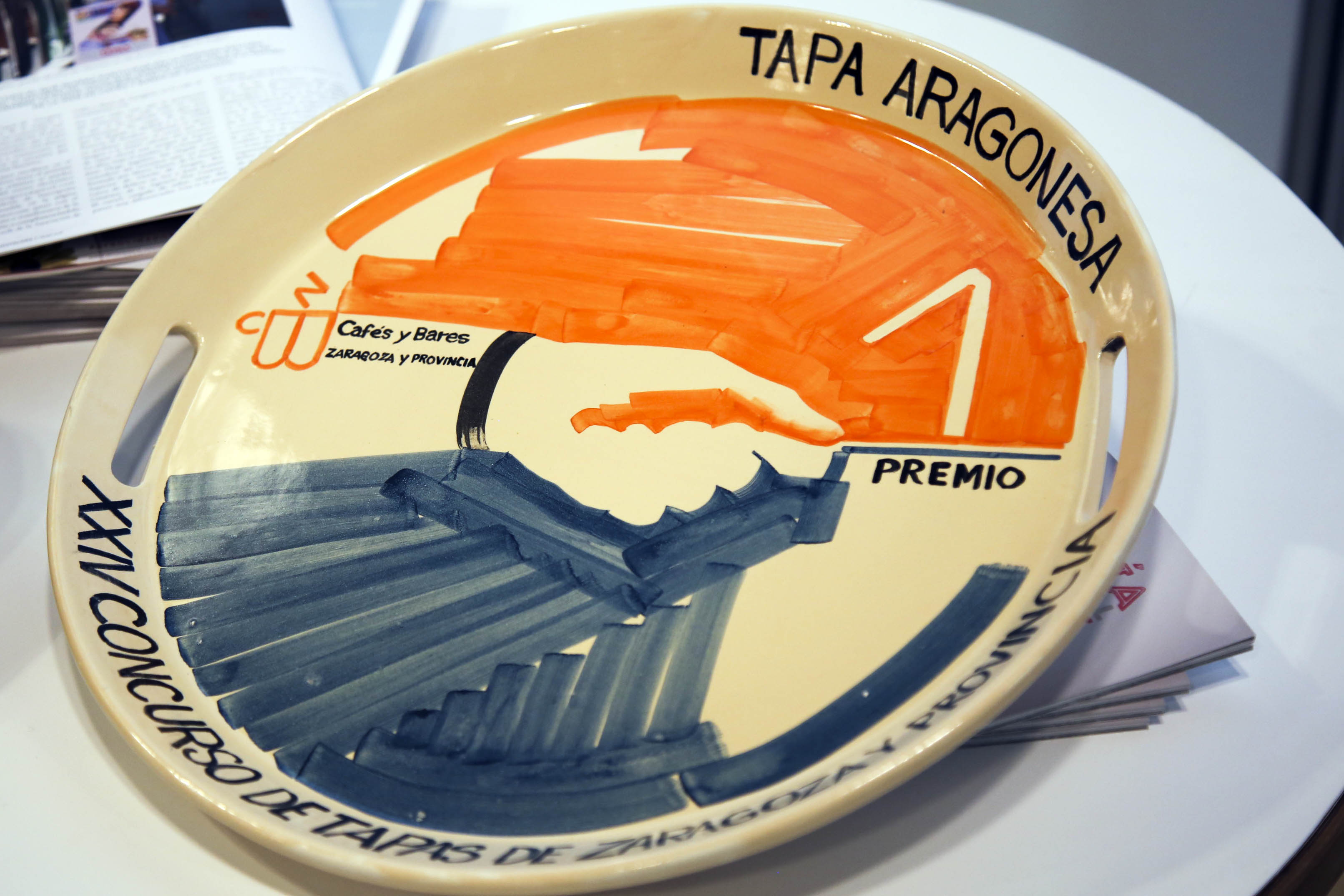 La bandeja redonda que se ofrendará a los galardonados de las distintas categorías está inspirada «en una revisión de arte pop, seleccionando sus colores planos: el naranja, desde un punto de vista más moderno, junto con el azul de la cerámica tradicional de Muel», que durante tantos certámenes anteriores ha simbolizado el reconocimiento que se han llevado los hosteleros premiados a sus establecimientos.